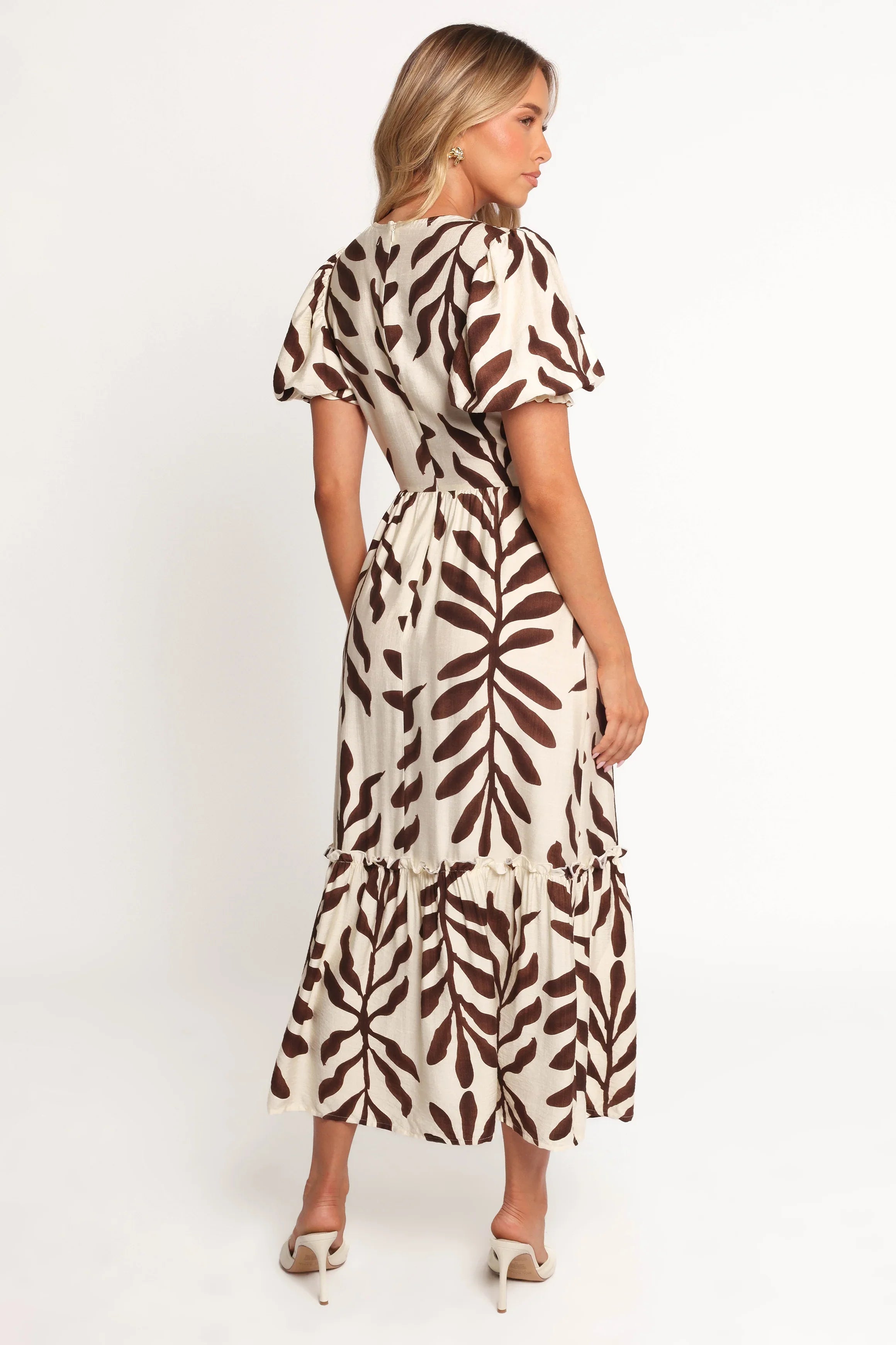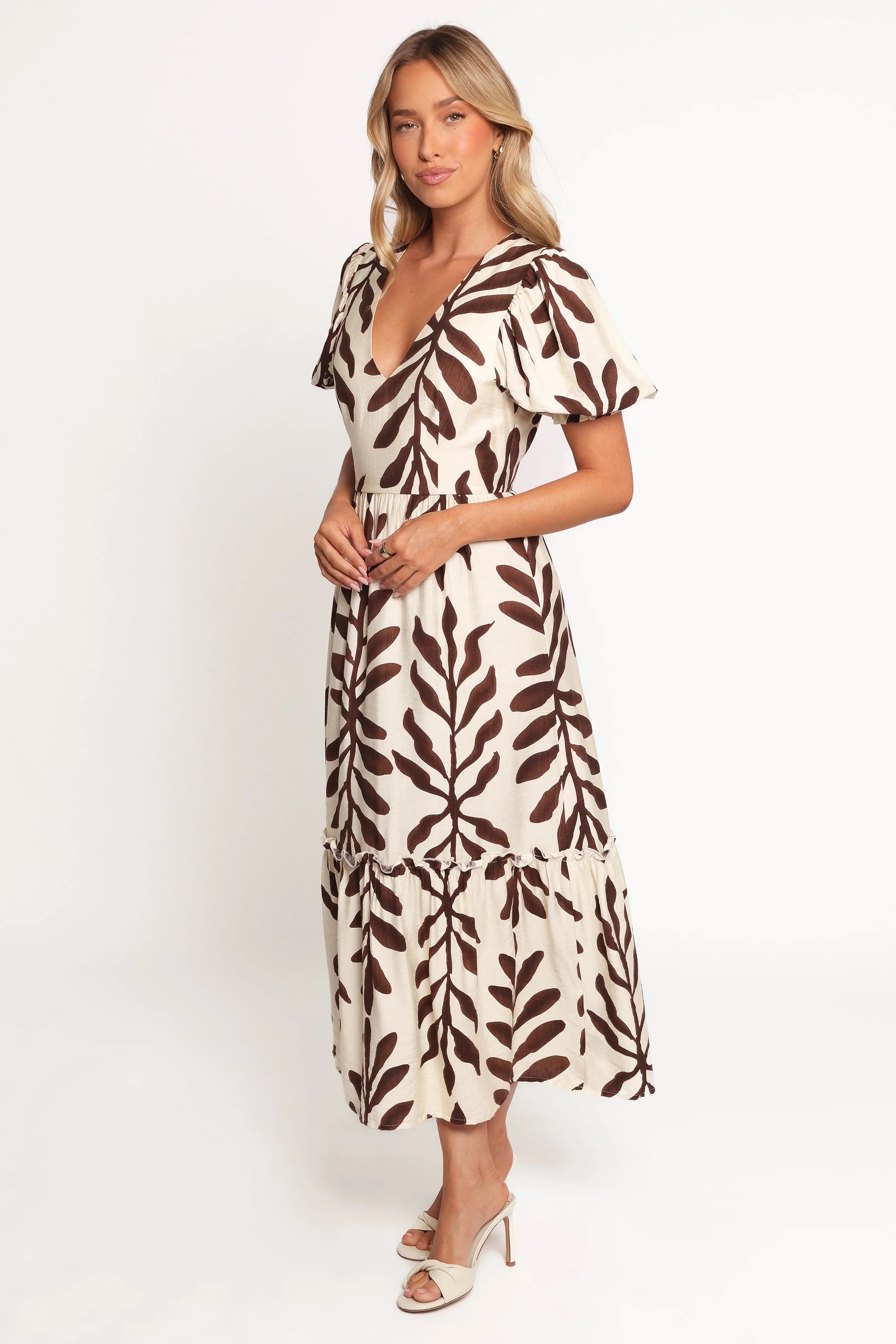 DETAILS The graceful midi-length design pairs seamlessly with a classic V-neckline, offering a flattering silhouette that works for any occasion. Its short puff sleeves, complete with elasticised cuffs, bring a playful yet polished vibe, while the flowing A-line skirt delivers ultimate comfort and versatile style.