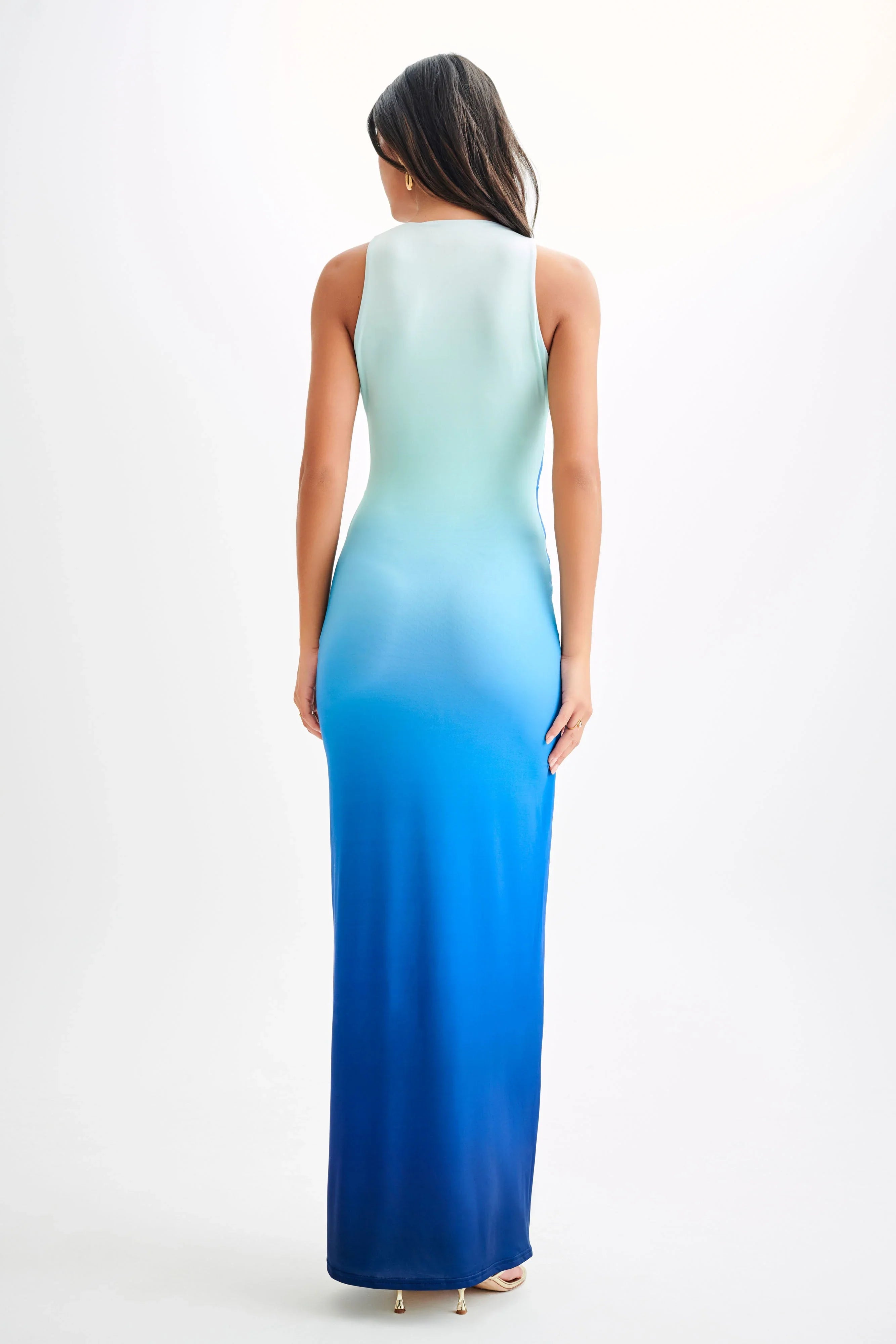 The STELLA Draped Slinky Maxi Dress is a stunning and sophisticated choice for any elegant occasion. This bodycon dress features a deep plunge neckline and a front twist detail that beautifully accentuates your silhouette. The ombre print adds a touch of modern flair, while the lined construction ensures comfort and confidence. With its graceful maxi length, the Stella dress effortlessly combines glamour and allure.