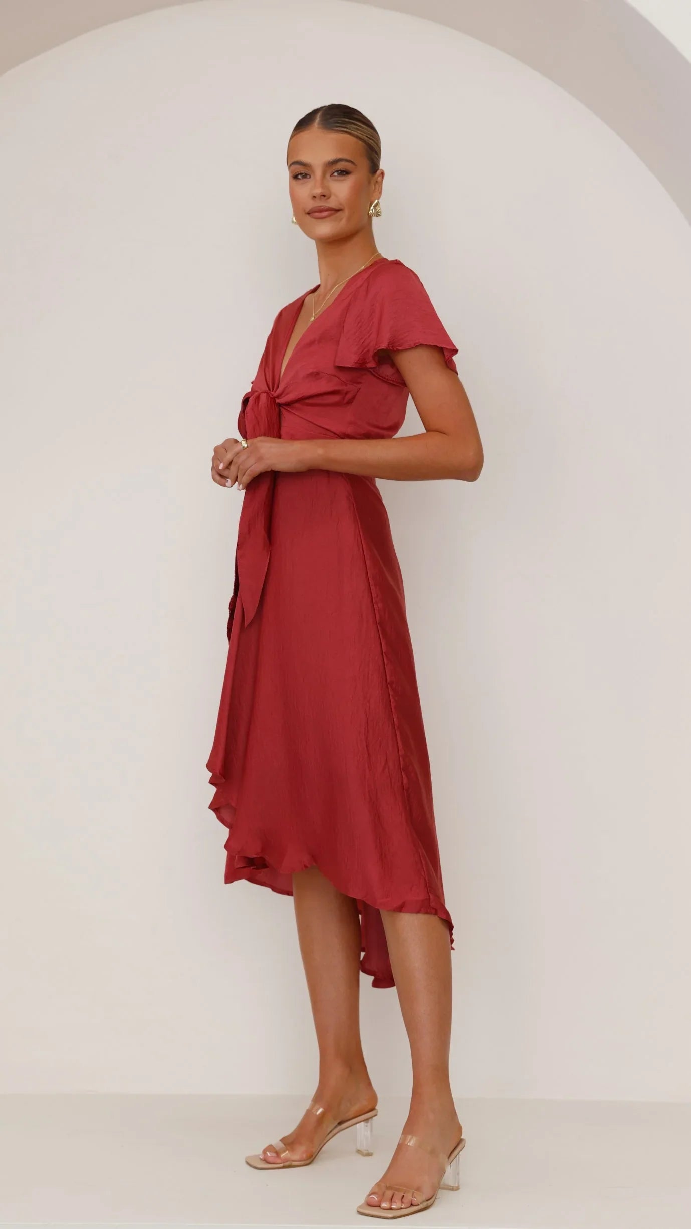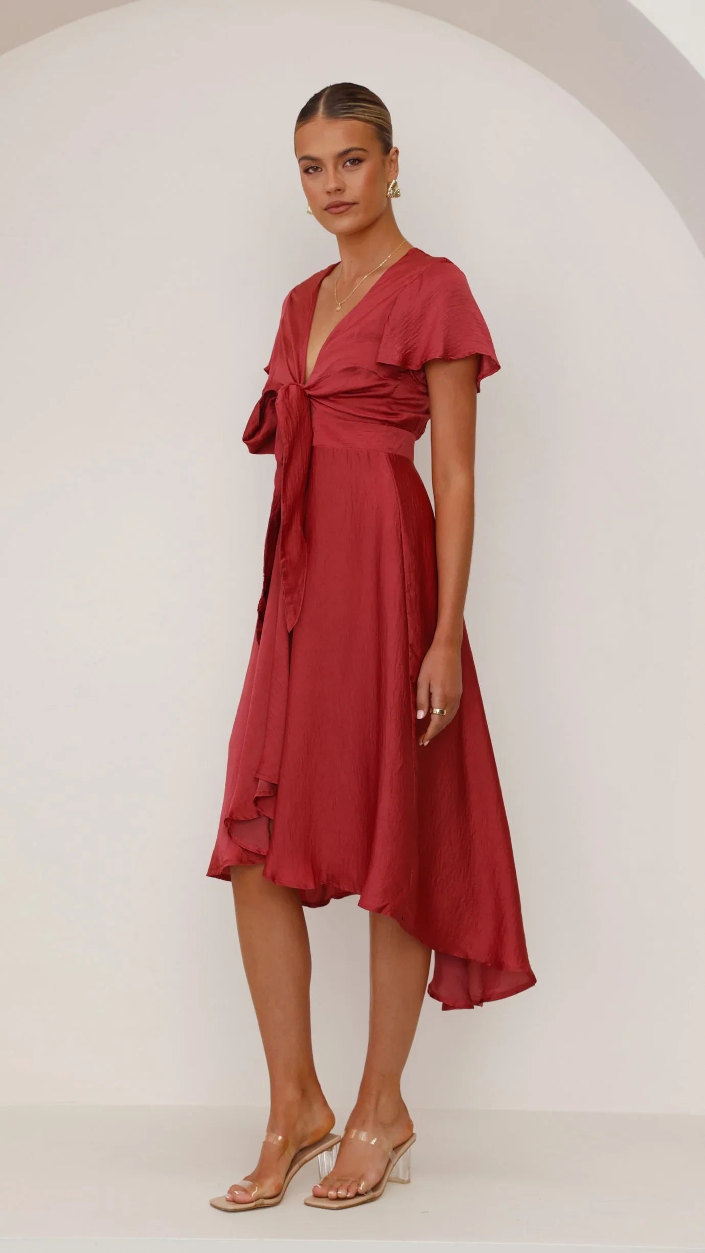 Our Sunny Daze Dress is a must have occasion piece, perfect for that upcoming party or wedding! This dress features butterfly sleeves, a soft satin feel and high low flowy skirt with a tight waistband. This piece will be your go to dress for impressing at any event, we suggest pairing with our and to finish the look.