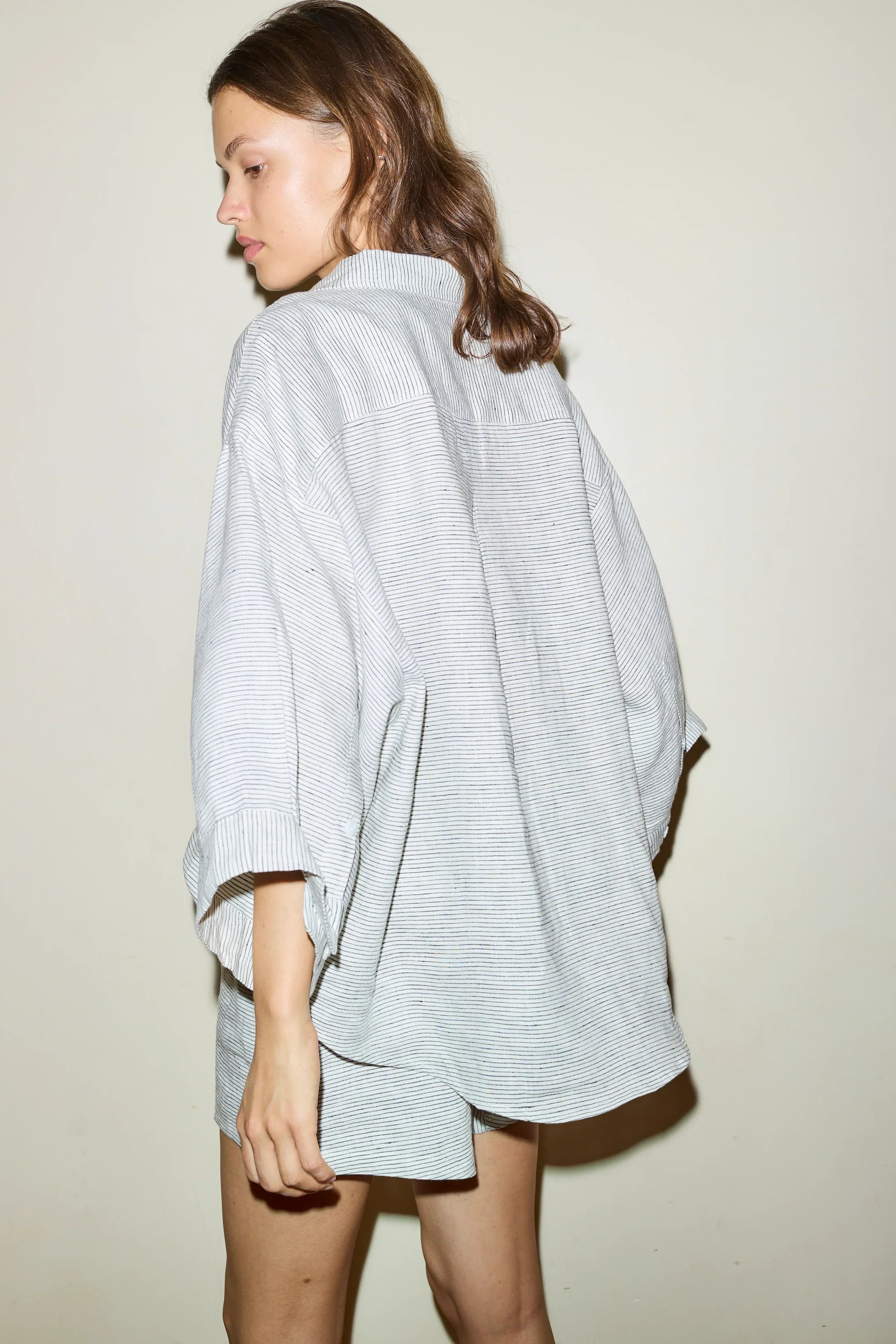 features an oversized box fit linen shirt with wide arms and a front pocket