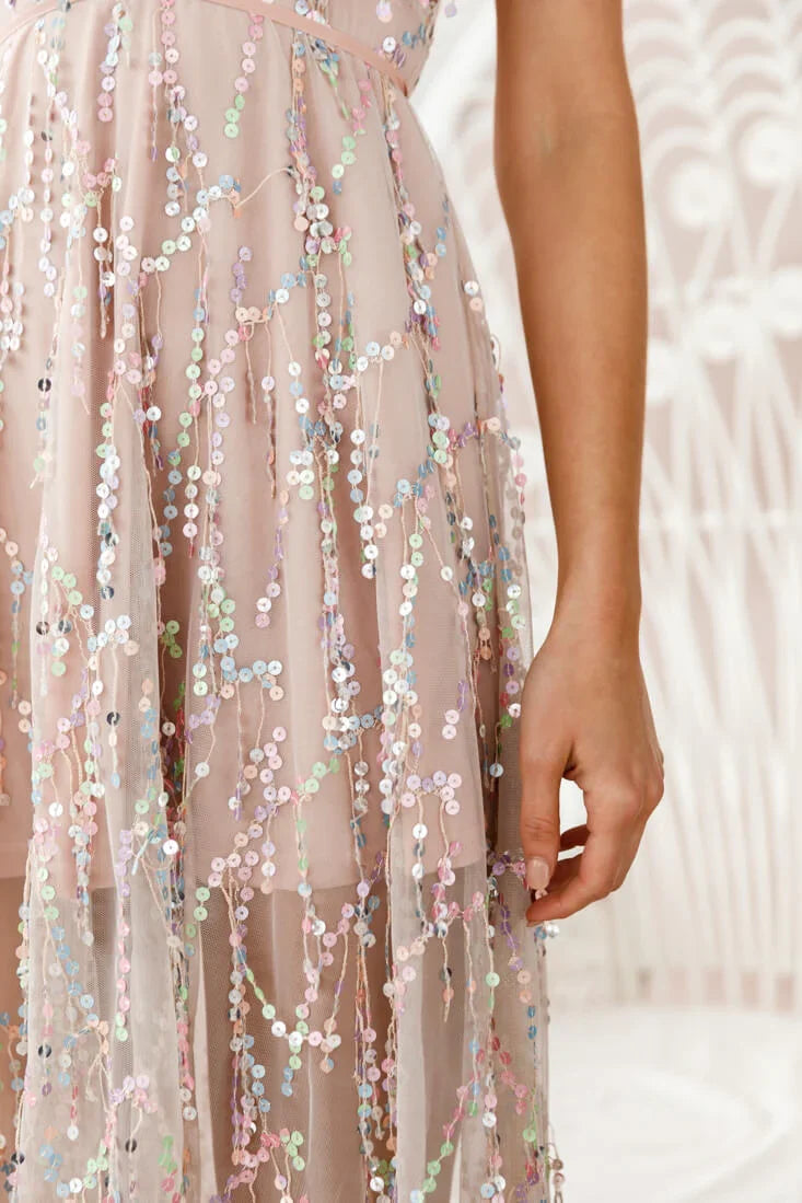 Omg we're speechless. And so will everyone else be the moment you walk into a room wearing this dress. Featuring the prettiest sequin covered chiffon overlay, plunging neckline and string-tie back, the Tiara is the perfect party dress for the girl who likes to steal the show. Pair it with strappy heels and get ready to turn heads.