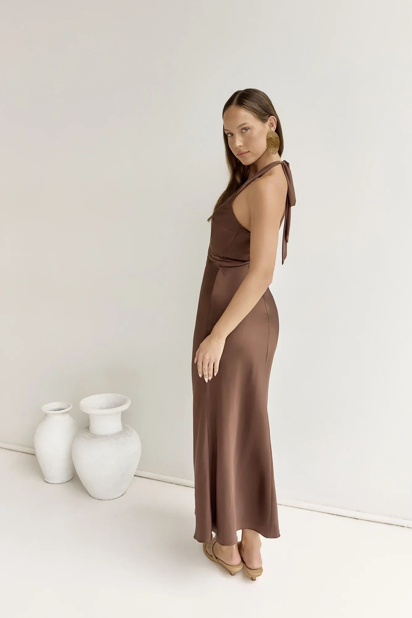 Celebrate moments at sundown in the To The Dreamers Satin Maxi Dress, a statement piece made for every occasion. A classic silhouette in soft satin fabric, this dress features mesh panelling to the bust and a halter tie made to turn heads in. Style with heels and gold adornments.