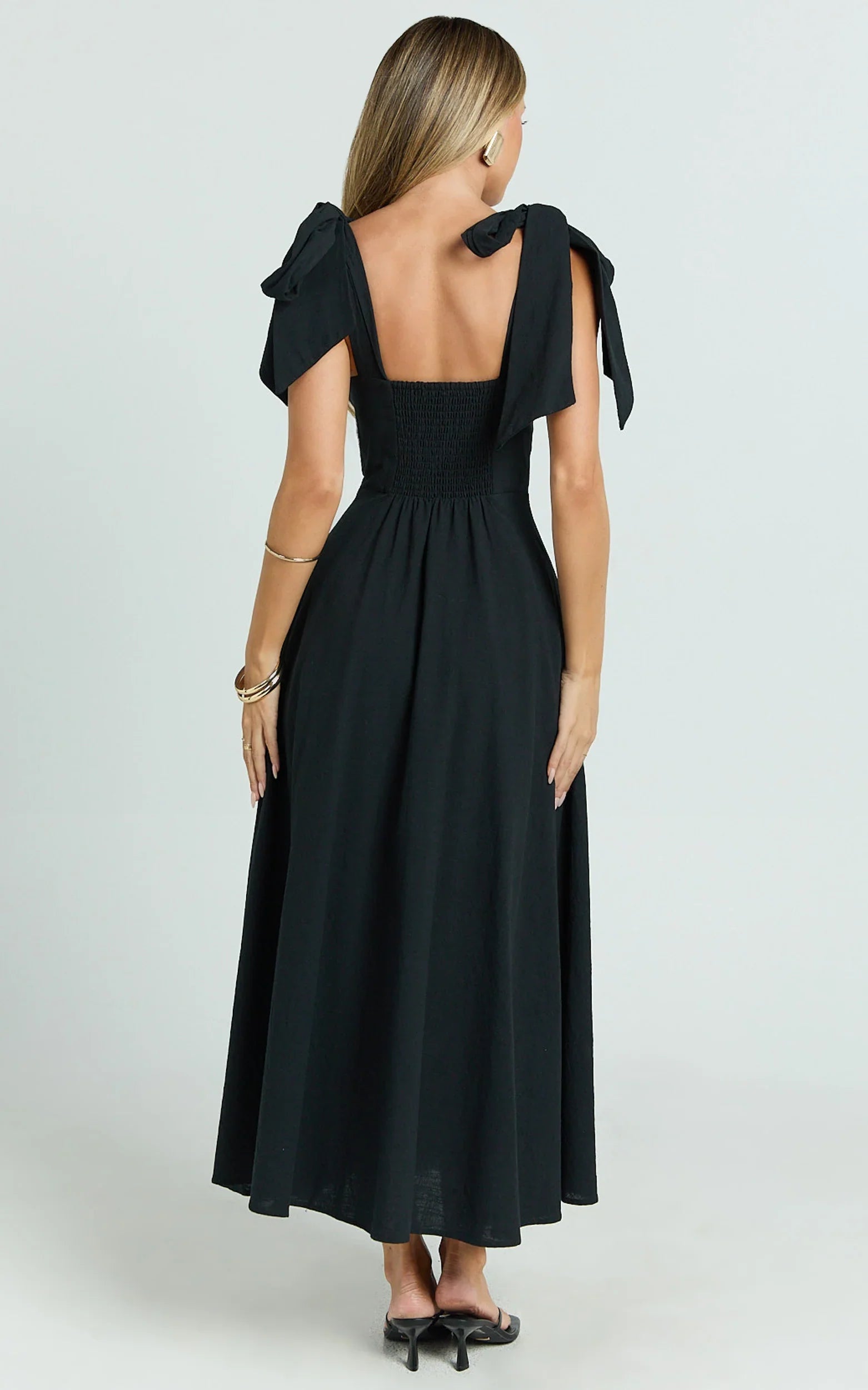Featuring a playful bustier-style bodice with delicate shoulder ties and a flattering shirred back panel, this dress hugs your silhouette beautifully before falling into an elegant A-line midi skirt. Inspired by minimalist runway looks yet versatile enough to suit any occasion, it’s guaranteed to be your go-to dress.