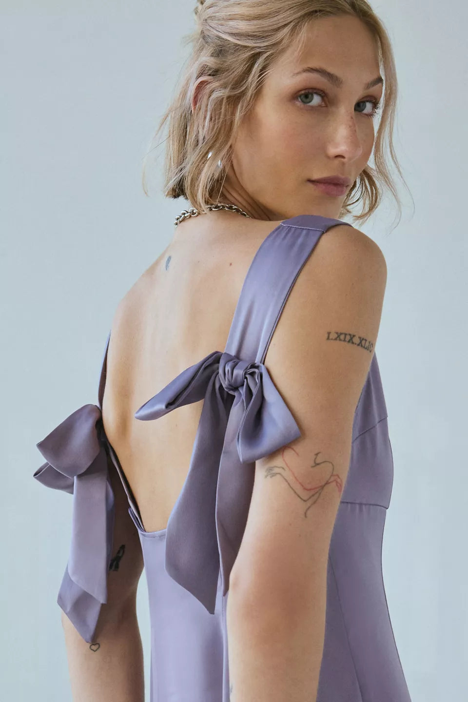 Effortlessly elegant and irresistibly feminine, this satin mini dress in a soft lavender hue is your go-to for romantic evenings and chic daytime events. Featuring a smooth, glossy satin finish, it drapes beautifully on the body with a flattering A-line silhouette. The standout backless design is adorned with oversized tie-shoulder straps, adding a playful and delicate touch. Perfect for weddings, date nights, or any occasion where you want to turn heads.