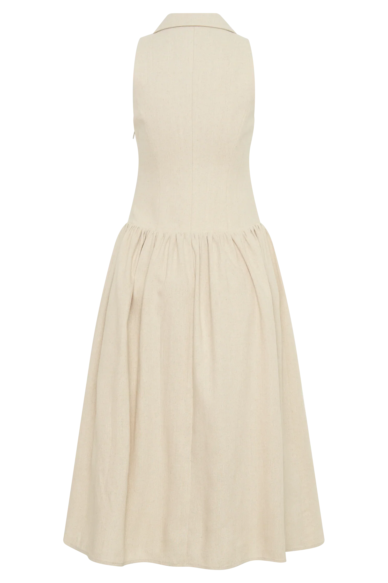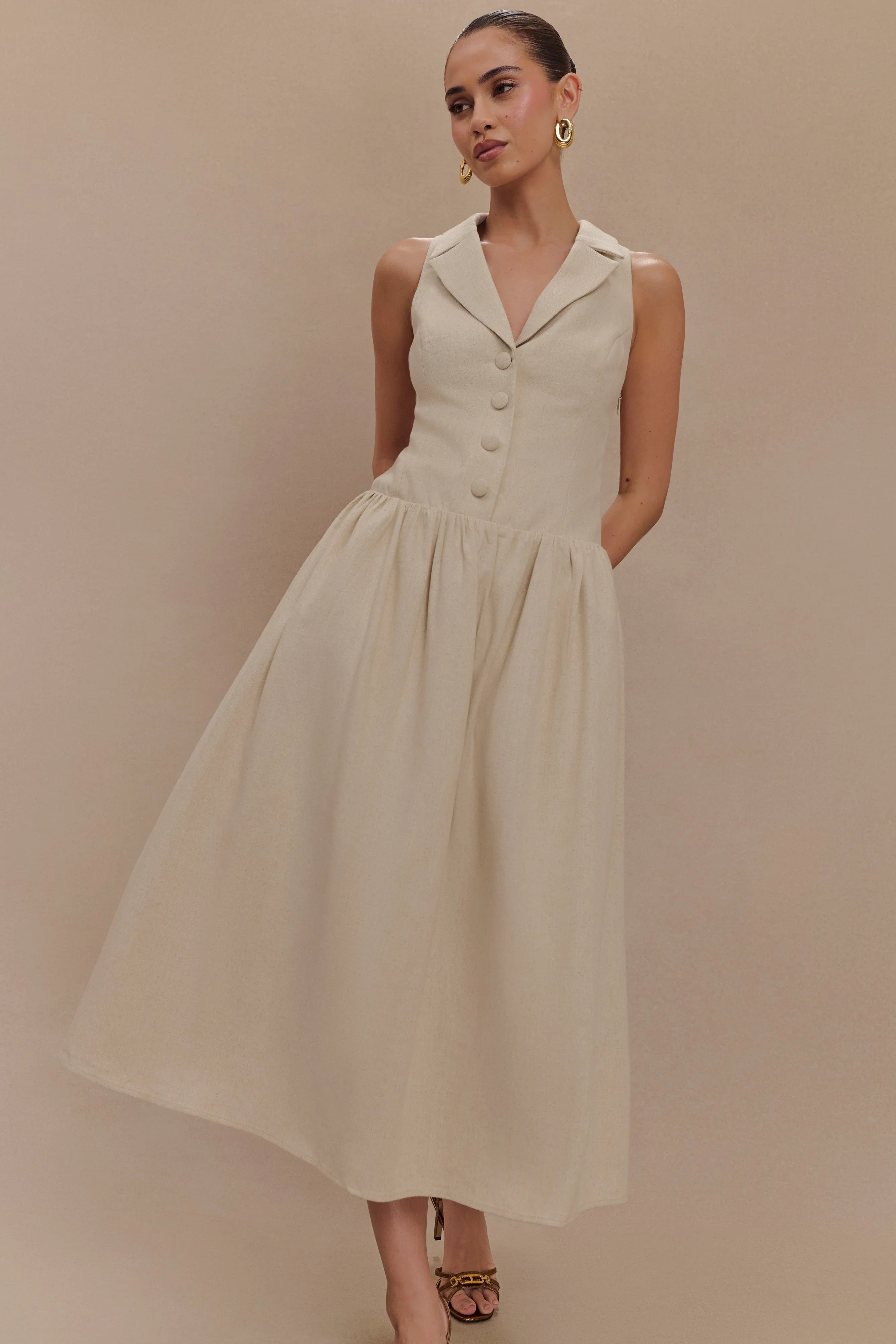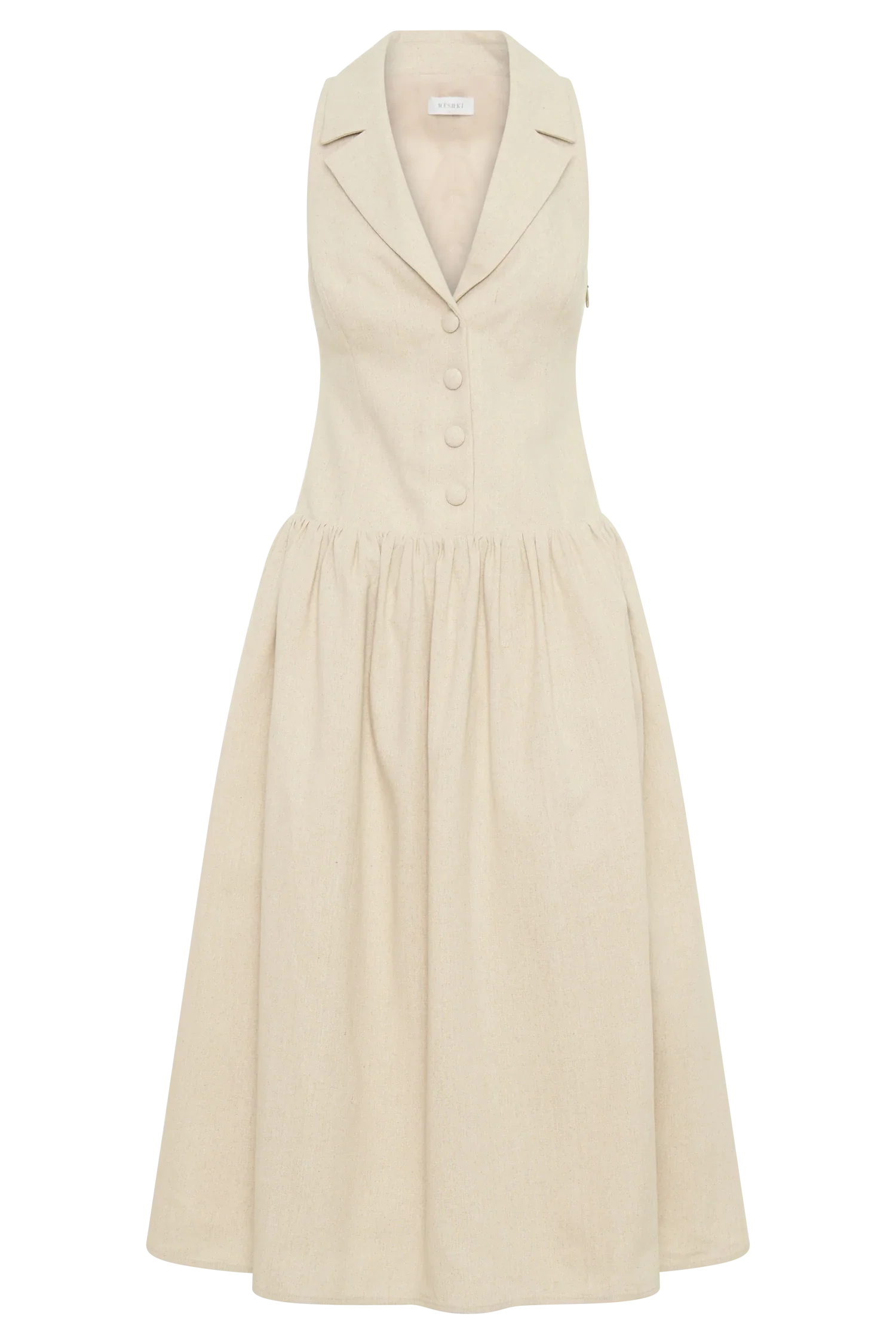 Effortlessly elegant and timelessly chic, the VALERY Linen Midi Collar Dress is a wardrobe must-have for refined style. Featuring a classic collared neckline and a functional centre-front button closure, this sleeveless dress blends sophistication with ease. The fitted bodice accentuates your silhouette, while the drop waist transitions into a full, gathered skirt for a flattering and graceful flow. Designed in a midi length and fully lined for comfort, this dress is perfect for brunches, garden parties, or warm-weather events.