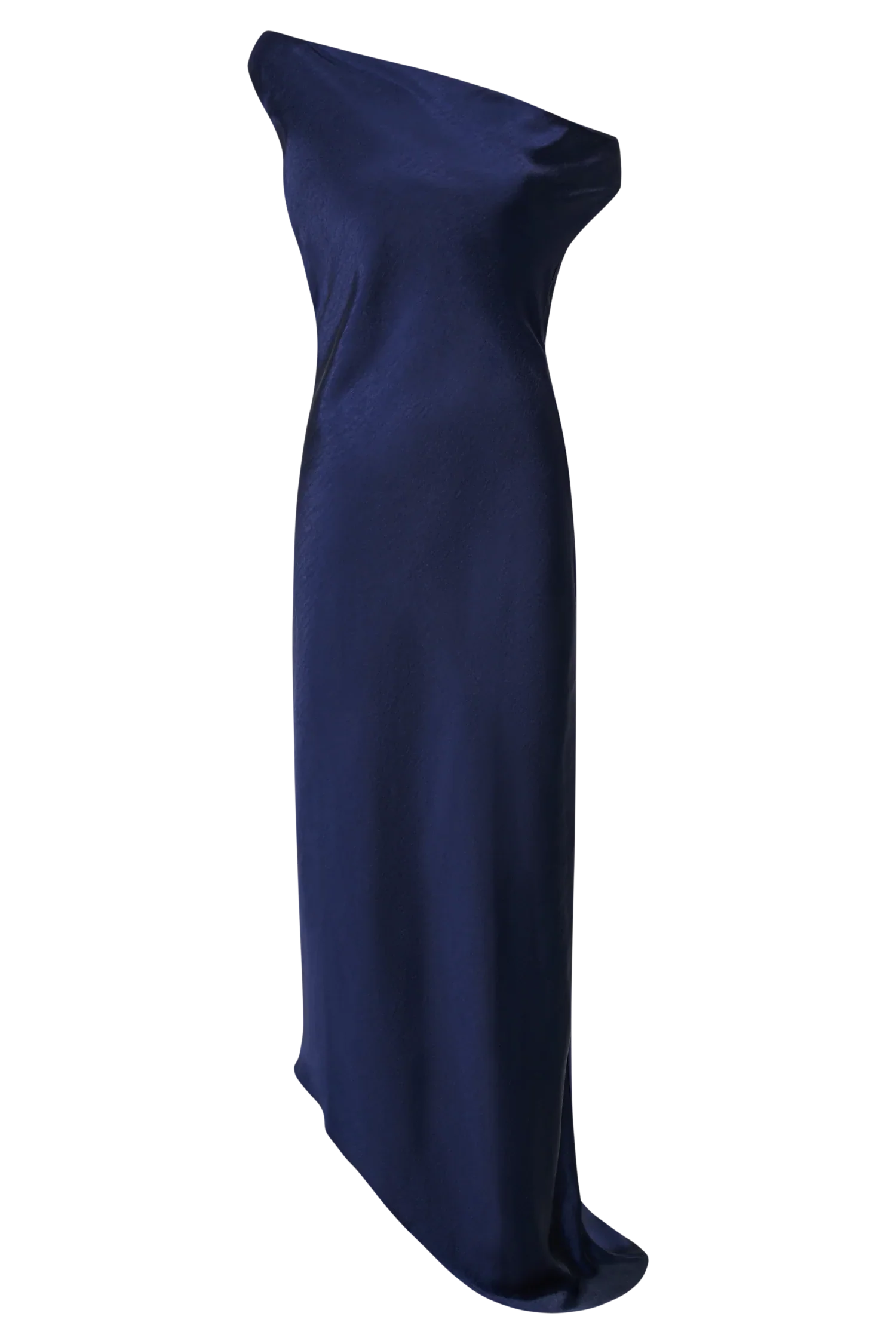 YVETTE is a Slip Maxi Dress with a low, open back, a slight cowl detail for the front neckline, and a loose, flowing hem. The front neckline dips into a slanted arrangement, with one shoulder strap up for a sleeveless look and the other down in an off-shoulder style. The asymmetrical hem is much the same, with one part gathered above the ankle and the other hitting the ground. Two thin fabric straps run across the back, adding extra detail to the low, back neckline.